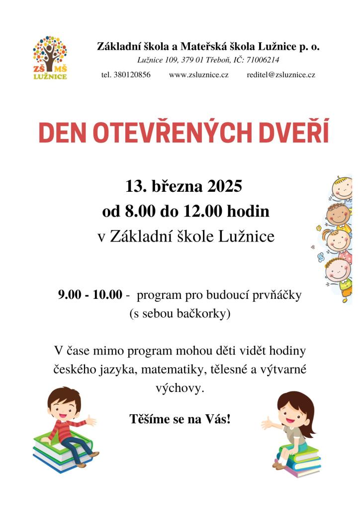 Naše škola v tento den přivítá všechny předškolní děti nejen z naší MŠ. Jsou zváni i další zájemci o lužnickou školu. Pro naše malé návštěvníky budeme mít připravené zábavné aktivity.